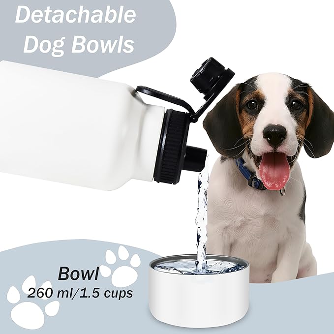 Get your paws on this 32oz double wall stainless steel water bottle with an attached bowl for your furry friend. Stay hydrated on your walks and share with your pup by pouring into the attached bowl - talk about dual purpose! Carry less and play more. Woof!